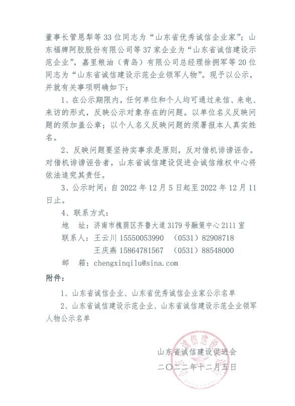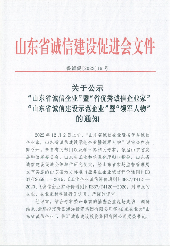 山东省诚信建设示范企业